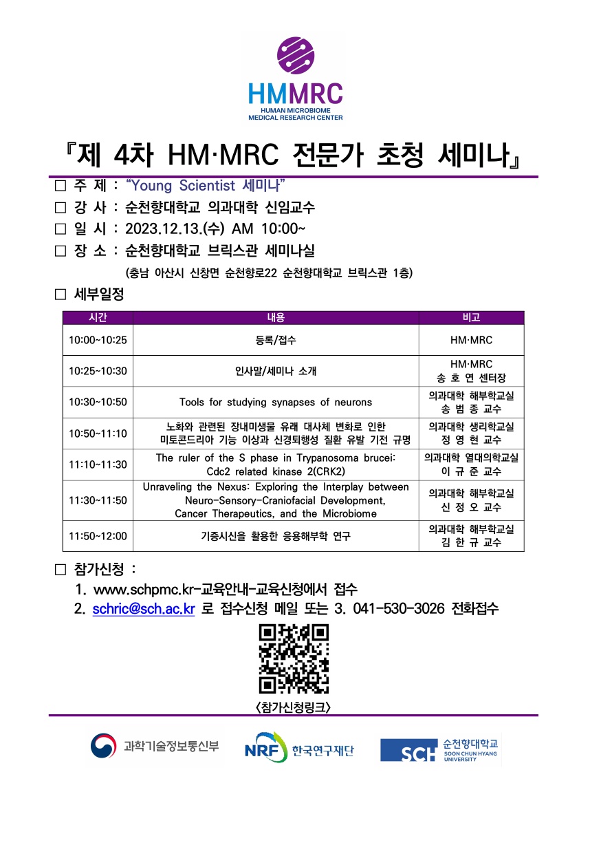 강연 및 세미나 [세미나] 제4차 HM·MRC 전문가 초청 세미나-Young Scientist 세미나 등록일 : 2024-03-11 조회수 : 352 이전글 [세미나] 제2차 HM·MRC 전문가 초청 세미나-맞춤형 케어푸드 다음글 [세미나] 제5차 HM·MRC 전문가 초청 세미나-GMP 품질관리와 바이오의약품 개발 프로세스 목록