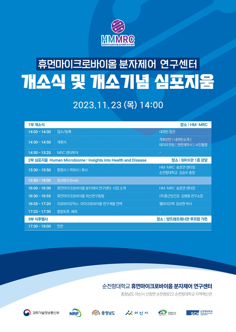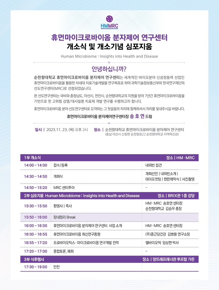 강연 및 세미나 [행사] 휴먼마이크로바이옴 분자제어 연구센터 개소식 및 개소기념 심포지움 개최 등록일 : 2024-02-20 조회수 : 393 이전글 이전글이 존재하지 않습니다. 다음글 [세미나] 휴먼마이크로바이옴 전문가 세미나-프로바이오틱스 공정개발 목록
