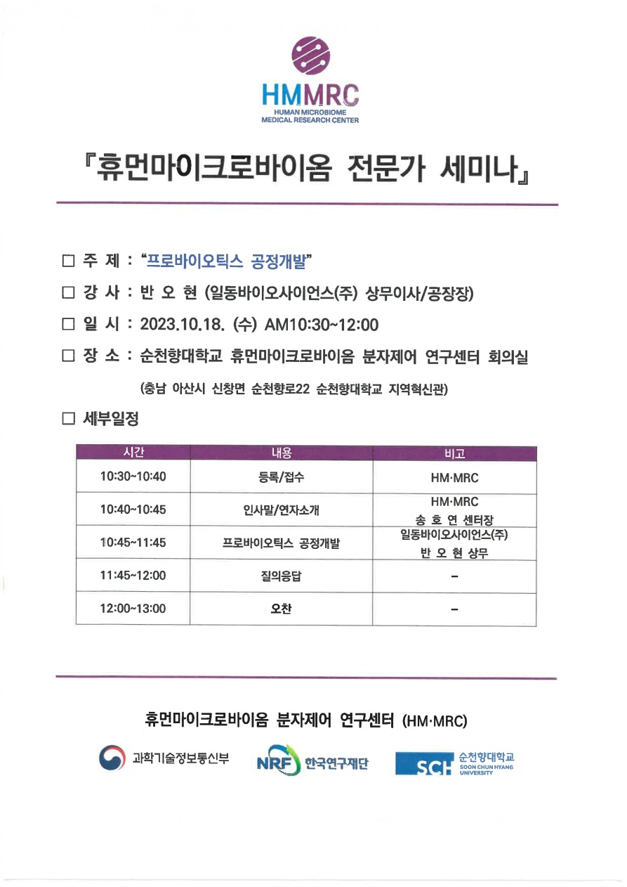 강연 및 세미나 [세미나] 휴먼마이크로바이옴 전문가 세미나-프로바이오틱스 공정개발 등록일 : 2024-03-04 조회수 : 395 이전글 [행사] 휴먼마이크로바이옴 분자제어 연구센터 개소식 및 개소기념 심포지움 개최 다음글 [세미나] 제2차 HM·MRC 전문가 초청 세미나-맞춤형 케어푸드 목록
